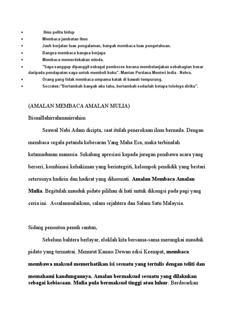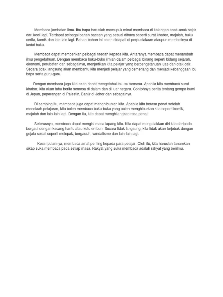 Jika kita rajin membaca maka bertambahlah . Membaca itu jambatan ilmu budaya membaca dapat melahirkan masyarakat yang cerdas,berdaya saing yang tinggi dan produktif. Melentur buluh biarlah dari rebung, oleh itu aktiviti membaca hendaklah dipupuk sejak . Bacang dibungkus tentu baunya keluar juga. Membaca jambatan ilmu bermaksud akan ilmu pengetahuan akan diperolehi dan dipertingkatkan dari masa ke semasa dengan cara pembacaan.